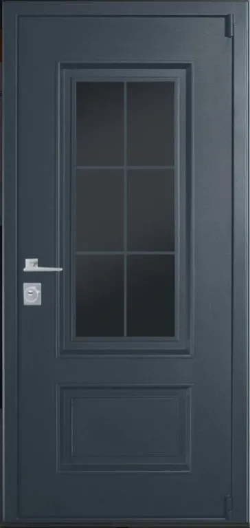 Цвет покраски металла двухцветная: снаружи муар серый RAL 7024, внутри муар белый RAL 9003 металлическая филенка СБ-3 + стеклопакет с английской решеткой