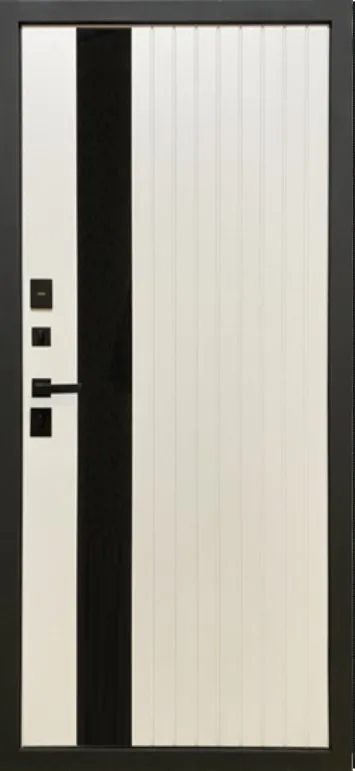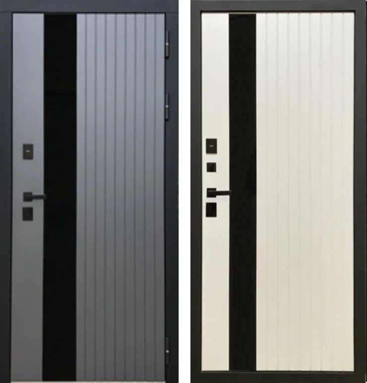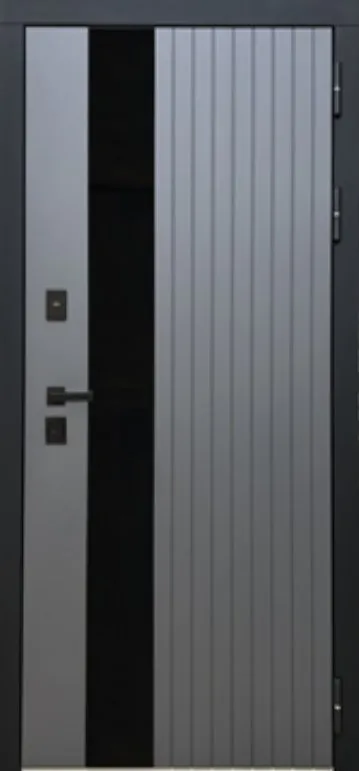Металл: Порошково-полимерное покрытие, цвет Муар черный лист стали + ламинированная МДФ панель 10мм , цвет Графит Нубук + вставка из черного лакобеля + наличник Антрацит софт